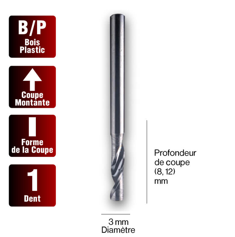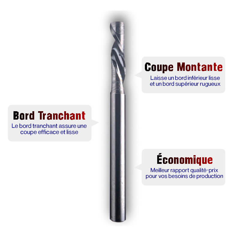 Évacuation des copeaux: La conception en coupe ascendante aspire les copeaux vers le haut et hors de la coupe. Assurez un dégagement suffisant et utilisez un jet d'air comprimé pour les évacuer.
