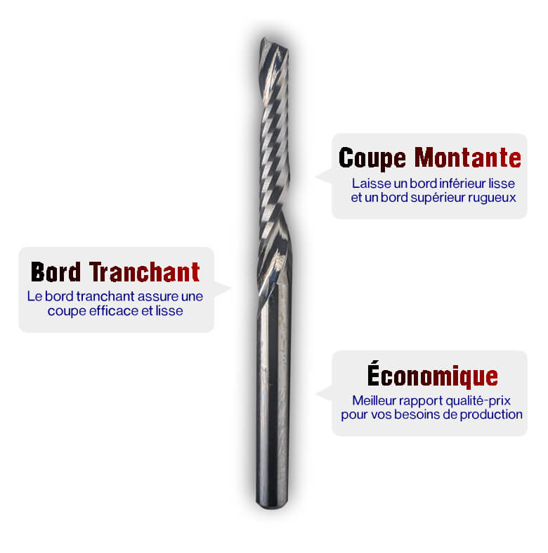 • Évacuation des copeaux: La conception en coupe ascendante aspire les copeaux vers le haut et hors de la coupe. Assurez un dégagement suffisant et utilisez un jet d'air comprimé pour les évacuer.